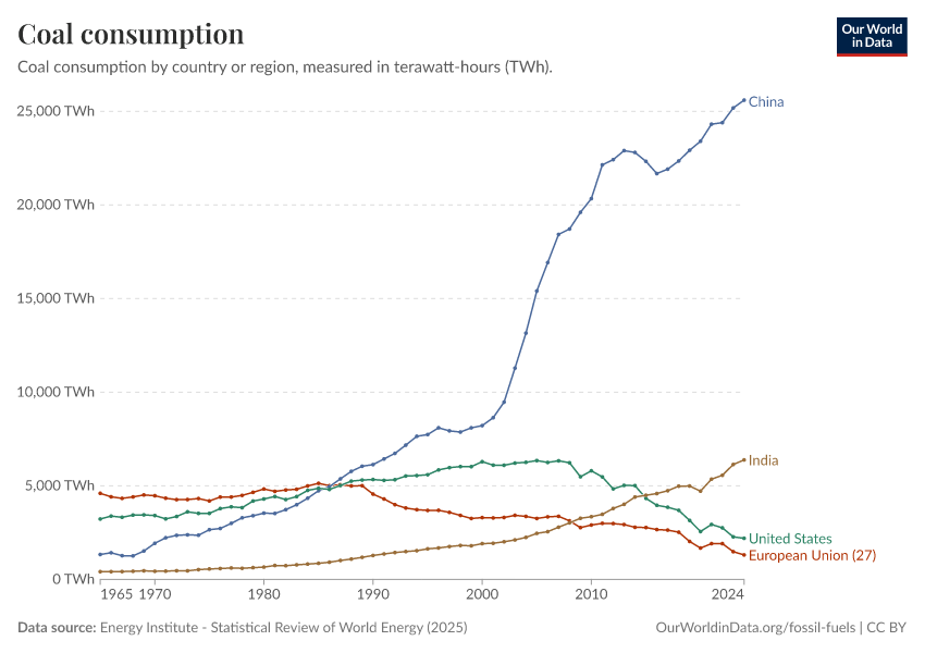 Energy Institute - Statistical Review of World Energy (2025) – with major processing by Our World in Data. “Coal consumption” [dataset]. Energy Institute, “Statistical Review of World Energy” [original data]. Retrieved January 14, 2026 from https://archive.ourworldindata.org/20250909-093708/grapher/coal-consumption-by-country-terawatt-hours-twh.html (archived on September 9, 2025).