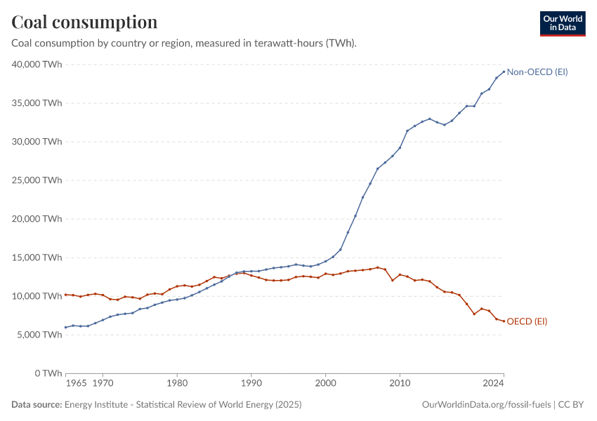 Energy Institute - Statistical Review of World Energy (2025) – with major processing by Our World in Data. “Coal consumption” [dataset]. Energy Institute, “Statistical Review of World Energy” [original data]. Retrieved February 11, 2026 from https://archive.ourworldindata.org/20260119-065148/grapher/coal-consumption-by-country-terawatt-hours-twh.html (archived on January 19, 2026).