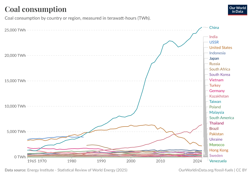 Energy Institute - Statistical Review of World Energy (2025) – with major processing by Our World in Data. “Coal consumption” [dataset]. Energy Institute, “Statistical Review of World Energy” [original data]. Retrieved November 8, 2025 from https://archive.ourworldindata.org/20250909-093708/grapher/coal-consumption-by-country-terawatt-hours-twh.html (archived on September 9, 2025).