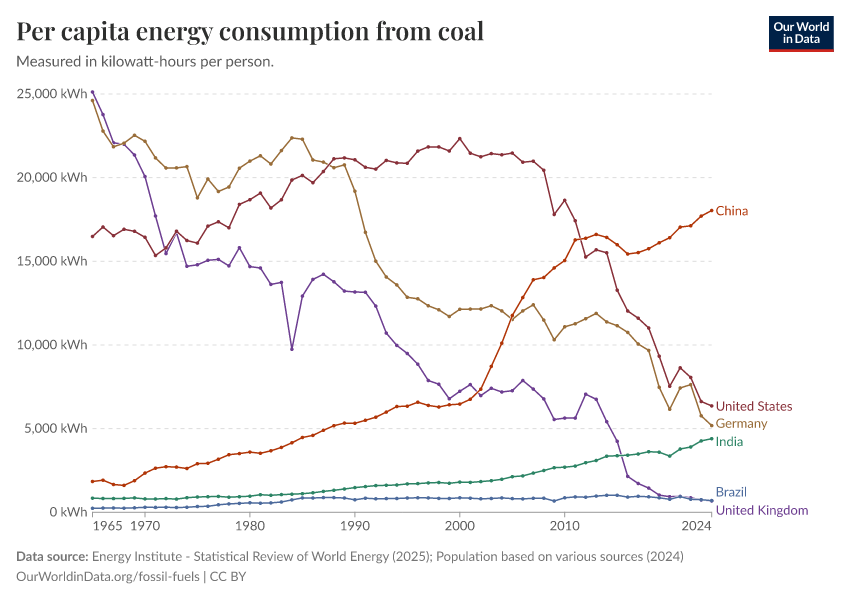 Energy Institute - Statistical Review of World Energy (2025); Population based on various sources (2024) – with major processing by Our World in Data. “Coal consumption per capita” [dataset]. Energy Institute, “Statistical Review of World Energy”; Various sources, “Population” [original data]. Retrieved April 6, 2026 from https://archive.ourworldindata.org/20260402-164039/grapher/coal-consumption-per-capita.html (archived on April 2, 2026).Download