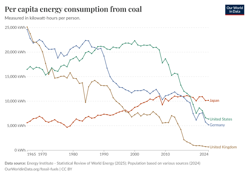 “Data Page: Coal consumption per capita”, part of the following publication: Hannah Ritchie, Pablo Rosado, and Max Roser (2023) - “Energy”. Data adapted from Energy Institute, Various sources. Retrieved from https://archive.ourworldindata.org/20260119-070102/grapher/coal-consumption-per-capita.html [online resource] (archived on January 19, 2026).How to cite this data
