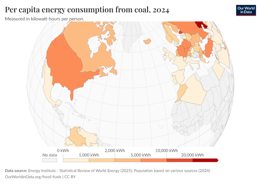 Energy Institute - Statistical Review of World Energy (2025); Population based on various sources (2024) – with major processing by Our World in Data. “Coal consumption per capita” [dataset]. Energy Institute, “Statistical Review of World Energy”; Various sources, “Population” [original data]. Retrieved April 5, 2026 from https://archive.ourworldindata.org/20260402-164039/grapher/coal-consumption-per-capita.html (archived on April 2, 2026).Download