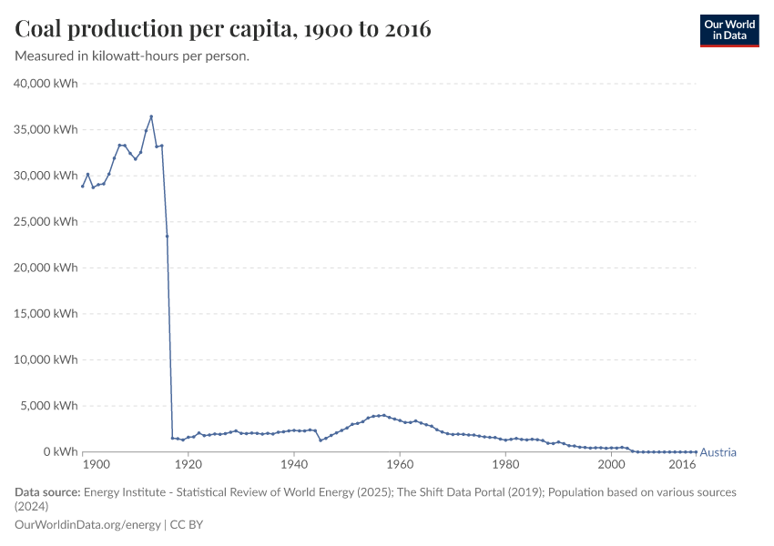 “Data Page: Coal production per capita”, part of the following publication: Hannah Ritchie, Pablo Rosado, and Max Roser (2023) - “Energy”. Data adapted from Energy Institute, The Shift Data Portal, Various sources. Retrieved from https://archive.ourworldindata.org/20250925-233948/grapher/coal-prod-per-capita.html [online resource] (archived on September 25, 2025).How to cite this data