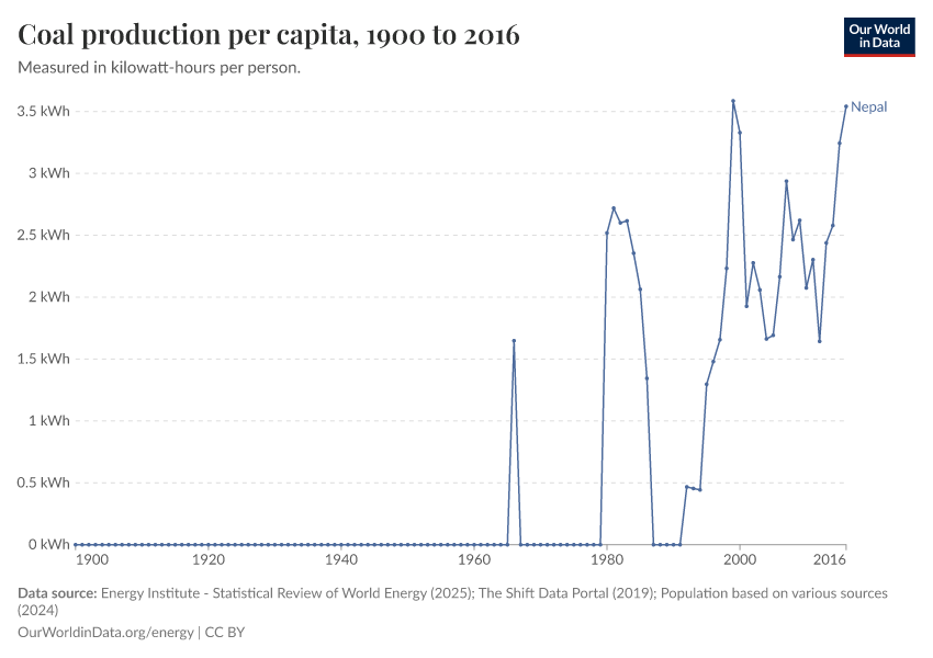 “Data Page: Coal production per capita”, part of the following publication: Hannah Ritchie, Pablo Rosado, and Max Roser (2023) - “Energy”. Data adapted from Energy Institute, The Shift Data Portal, Various sources. Retrieved from https://archive.ourworldindata.org/20250925-233948/grapher/coal-prod-per-capita.html [online resource] (archived on September 25, 2025).How to cite this data
