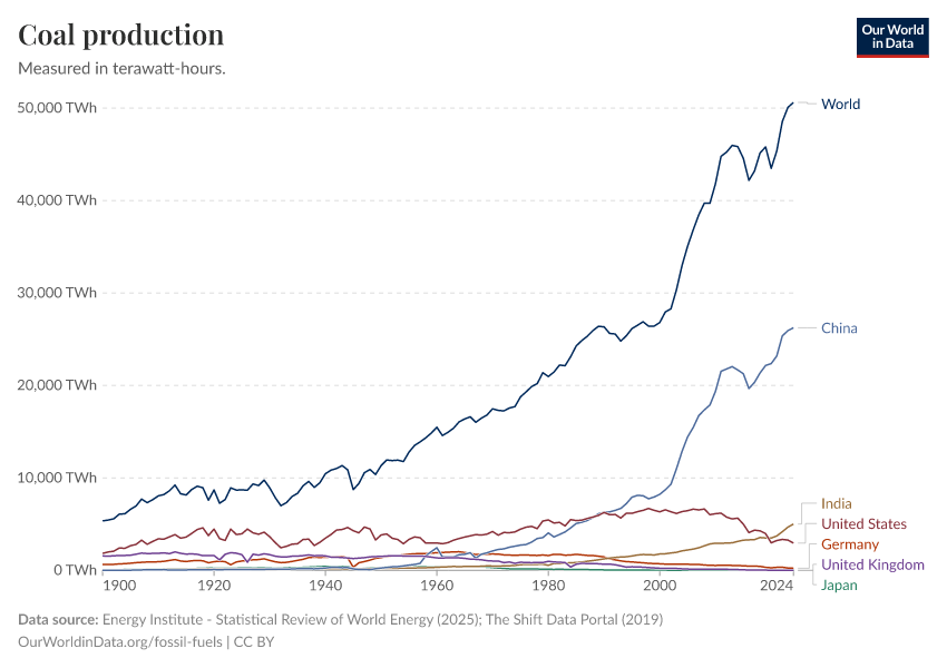 “Data Page: Coal production”, part of the following publication: Hannah Ritchie, Pablo Rosado, and Max Roser (2023) - “Energy”. Data adapted from Energy Institute, The Shift Data Portal. Retrieved from https://archive.ourworldindata.org/20250909-093708/grapher/coal-production-by-country.html [online resource] (archived on September 9, 2025).How to cite this data