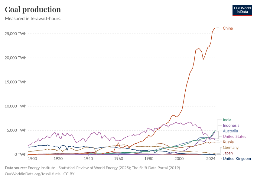 “Data Page: Coal production”, part of the following publication: Hannah Ritchie, Pablo Rosado, and Max Roser (2023) - “Energy”. Data adapted from Energy Institute, The Shift Data Portal. Retrieved from https://archive.ourworldindata.org/20250909-093708/grapher/coal-production-by-country.html [online resource] (archived on September 9, 2025).How to cite this data