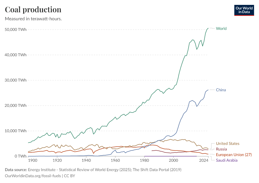 “Data Page: Coal production”, part of the following publication: Hannah Ritchie, Pablo Rosado, and Max Roser (2023) - “Energy”. Data adapted from Energy Institute, The Shift Data Portal. Retrieved from https://archive.ourworldindata.org/20250909-093708/grapher/coal-production-by-country.html [online resource] (archived on September 9, 2025).How to cite this data