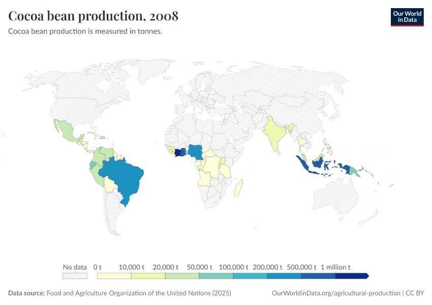 “Data Page: Cocoa bean production”, part of the following publication: Hannah Ritchie, Pablo Rosado, and Max Roser (2023) - “Agricultural Production”. Data adapted from Food and Agriculture Organization of the United Nations. Retrieved from https://archive.ourworldindata.org/20250909-093708/grapher/cocoa-bean-production.html [online resource] (archived on September 9, 2025).How to cite this data
