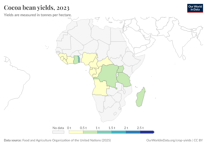 “Data Page: Cocoa bean yields”, part of the following publication: Hannah Ritchie, Pablo Rosado, and Max Roser (2023) - “Agricultural Production”. Data adapted from Food and Agriculture Organization of the United Nations. Retrieved from https://archive.ourworldindata.org/20250909-093708/grapher/cocoa-bean-yields.html [online resource] (archived on September 9, 2025).How to cite this data