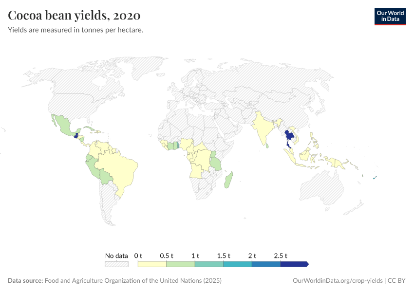 Food and Agriculture Organization of the United Nations (2025) – with major processing by Our World in Data. “Cocoa bean yields – UN FAO” [dataset]. Food and Agriculture Organization of the United Nations, “Production: Crops and livestock products” [original data]. Retrieved December 7, 2025 from https://archive.ourworldindata.org/20250909-093708/grapher/cocoa-bean-yields.html (archived on September 9, 2025).