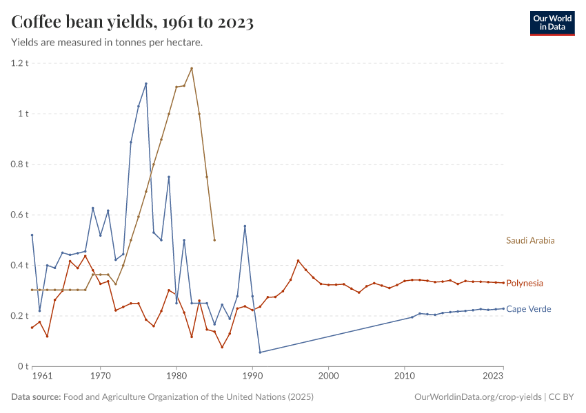 Food and Agriculture Organization of the United Nations (2025) – with major processing by Our World in Data. “Coffee bean yields – UN FAO” [dataset]. Food and Agriculture Organization of the United Nations, “Production: Crops and livestock products” [original data]. Retrieved December 19, 2025 from https://archive.ourworldindata.org/20250909-093708/grapher/coffee-yields.html (archived on September 9, 2025).