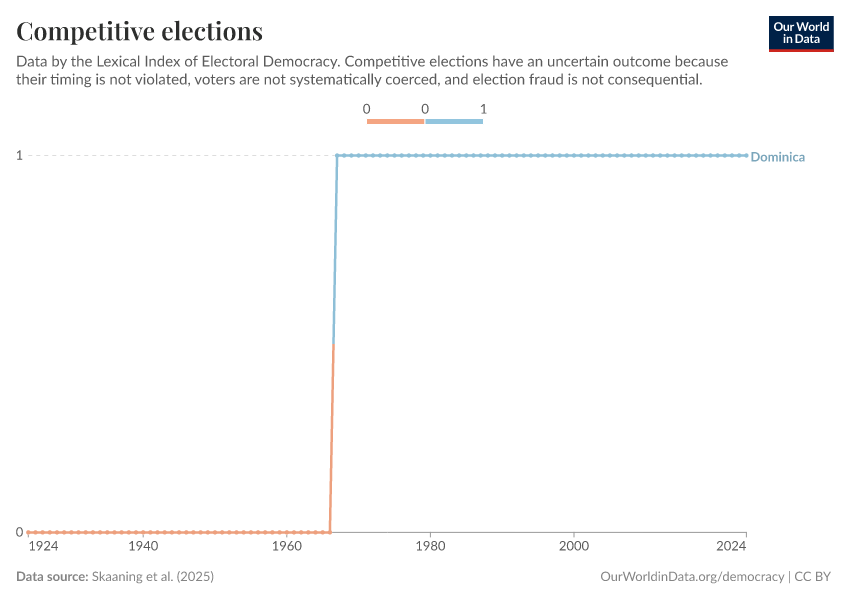 Skaaning et al. (2025) – processed by Our World in Data. “Competitive elections” [dataset]. Skaaning et al., “Lexical Index of Electoral Democracy (LIED) v6.8” [original data]. Retrieved January 2, 2026 from https://archive.ourworldindata.org/20250909-093708/grapher/competitive-elections-lexical.html (archived on September 9, 2025).