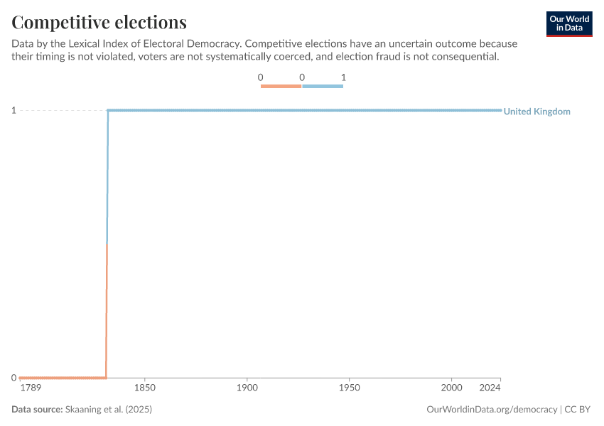 Skaaning et al. (2025) – processed by Our World in Data. “Competitive elections” [dataset]. Skaaning et al., “Lexical Index of Electoral Democracy (LIED) v6.8” [original data]. Retrieved January 13, 2026 from https://archive.ourworldindata.org/20250909-093708/grapher/competitive-elections-lexical.html (archived on September 9, 2025).