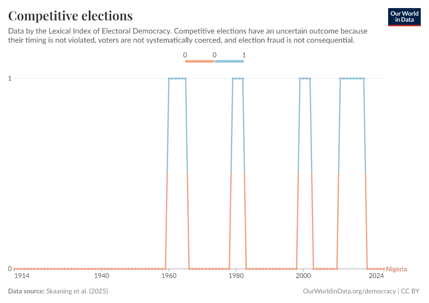 Skaaning et al. (2025) – processed by Our World in Data. “Competitive elections” [dataset]. Skaaning et al., “Lexical Index of Electoral Democracy (LIED) v6.8” [original data]. Retrieved December 28, 2025 from https://archive.ourworldindata.org/20250909-093708/grapher/competitive-elections-lexical.html (archived on September 9, 2025).