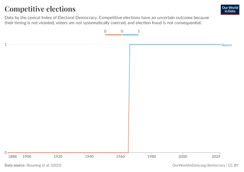 Skaaning et al. (2025) – processed by Our World in Data. “Competitive elections” [dataset]. Skaaning et al., “Lexical Index of Electoral Democracy (LIED) v6.8” [original data]. Retrieved January 12, 2026 from https://archive.ourworldindata.org/20250909-093708/grapher/competitive-elections-lexical.html (archived on September 9, 2025).