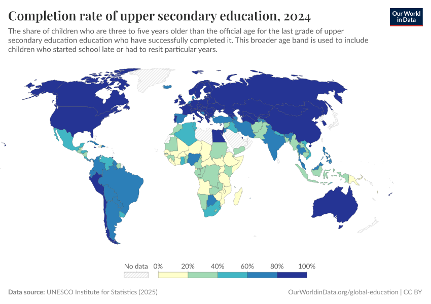 UNESCO Institute for Statistics (2025) – with minor processing by Our World in Data. “Completion rate in upper secondary education” [dataset]. UNESCO Institute for Statistics, “UNESCO Institute for Statistics (UIS) - Education” [original data]. Retrieved December 25, 2025 from https://archive.ourworldindata.org/20250909-093708/grapher/completion-rate-of-upper-secondary-education-sdg.html (archived on September 9, 2025).