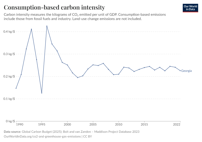 “Data Page: Consumption-based carbon intensity”, part of the following publication: Hannah Ritchie, Pablo Rosado, and Max Roser (2023) - “CO₂ and Greenhouse Gas Emissions”. Data adapted from Global Carbon Project, Bolt and van Zanden. Retrieved from https://archive.ourworldindata.org/20251204-133459/grapher/consumption-based-carbon-intensity.html [online resource] (archived on December 4, 2025).How to cite this data