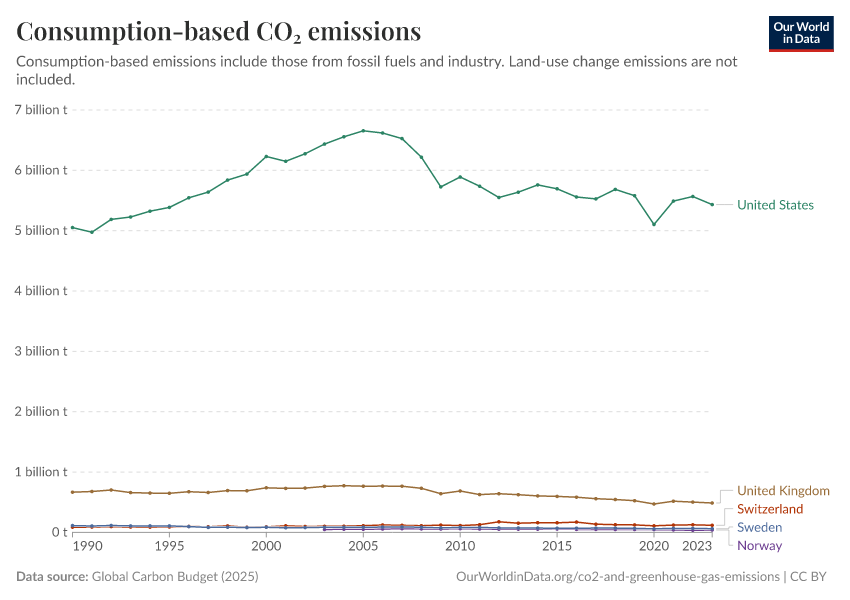 “Data Page: Consumption-based CO₂ emissions”, part of the following publication: Hannah Ritchie, Pablo Rosado, and Max Roser (2023) - “CO₂ and Greenhouse Gas Emissions”. Data adapted from Global Carbon Project. Retrieved from https://archive.ourworldindata.org/20251204-133459/grapher/consumption-co2-emissions.html [online resource] (archived on December 4, 2025).How to cite this data