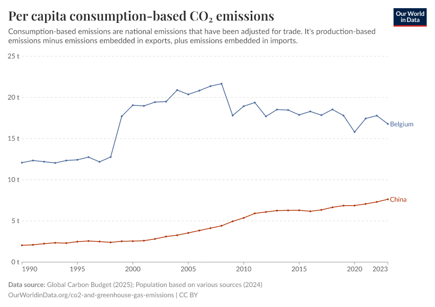 “Data Page: Per capita consumption-based CO₂ emissions”, part of the following publication: Hannah Ritchie, Pablo Rosado, and Max Roser (2023) - “CO₂ and Greenhouse Gas Emissions”. Data adapted from Global Carbon Project, Various sources. Retrieved from https://archive.ourworldindata.org/20251204-133459/grapher/consumption-co2-per-capita.html [online resource] (archived on December 4, 2025).How to cite this data