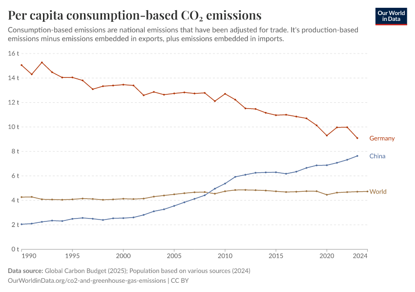 “Data Page: Per capita consumption-based CO₂ emissions”, part of the following publication: Hannah Ritchie, Pablo Rosado, and Max Roser (2023) - “CO₂ and Greenhouse Gas Emissions”. Data adapted from Global Carbon Project, Various sources. Retrieved from https://archive.ourworldindata.org/20260304-094028/grapher/consumption-co2-per-capita.html [online resource] (archived on March 4, 2026).