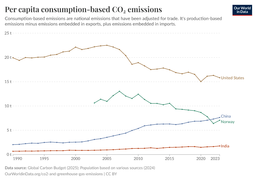 “Data Page: Per capita consumption-based CO₂ emissions”, part of the following publication: Hannah Ritchie, Pablo Rosado, and Max Roser (2023) - “CO₂ and Greenhouse Gas Emissions”. Data adapted from Global Carbon Project, Various sources. Retrieved from https://archive.ourworldindata.org/20251204-133459/grapher/consumption-co2-per-capita.html [online resource] (archived on December 4, 2025).How to cite this data