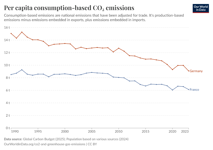“Data Page: Per capita consumption-based CO₂ emissions”, part of the following publication: Hannah Ritchie, Pablo Rosado, and Max Roser (2023) - “CO₂ and Greenhouse Gas Emissions”. Data adapted from Global Carbon Project, Various sources. Retrieved from https://archive.ourworldindata.org/20260417-112857/grapher/consumption-co2-per-capita.html [online resource] (archived on April 17, 2026).How to cite this data