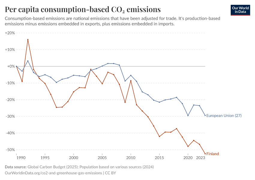“Data Page: Per capita consumption-based CO₂ emissions”, part of the following publication: Hannah Ritchie, Pablo Rosado, and Max Roser (2023) - “CO₂ and Greenhouse Gas Emissions”. Data adapted from Global Carbon Project, Various sources. Retrieved from https://archive.ourworldindata.org/20251204-133459/grapher/consumption-co2-per-capita.html [online resource] (archived on December 4, 2025).