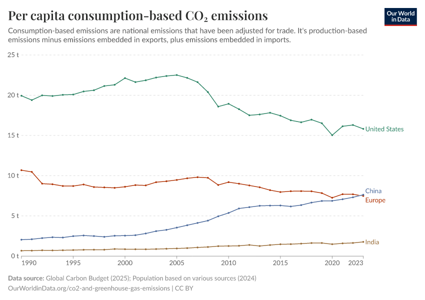 “Data Page: Per capita consumption-based CO₂ emissions”, part of the following publication: Hannah Ritchie, Pablo Rosado, and Max Roser (2023) - “CO₂ and Greenhouse Gas Emissions”. Data adapted from Global Carbon Project, Various sources. Retrieved from https://archive.ourworldindata.org/20251204-133459/grapher/consumption-co2-per-capita.html [online resource] (archived on December 4, 2025).How to cite this data