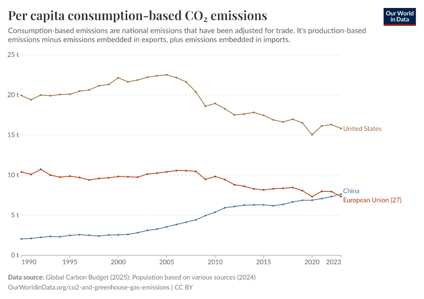 Global Carbon Budget (2025); Population based on various sources (2024) – with major processing by Our World in Data. “Per capita consumption-based CO₂ emissions – Global Carbon Project” [dataset]. Global Carbon Project, “Global Carbon Budget v15”; Various sources, “Population” [original data]. Retrieved January 5, 2026 from https://archive.ourworldindata.org/20251204-133459/grapher/consumption-co2-per-capita.html (archived on December 4, 2025).