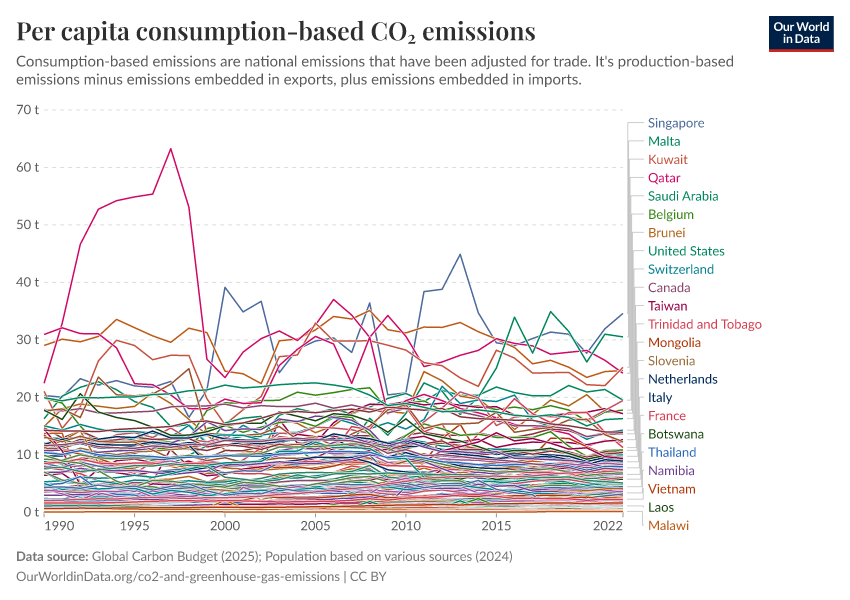 “Data Page: Per capita consumption-based CO₂ emissions”, part of the following publication: Hannah Ritchie, Pablo Rosado, and Max Roser (2023) - “CO₂ and Greenhouse Gas Emissions”. Data adapted from Global Carbon Project, Various sources. Retrieved from https://archive.ourworldindata.org/20251204-133459/grapher/consumption-co2-per-capita.html [online resource] (archived on December 4, 2025).How to cite this data