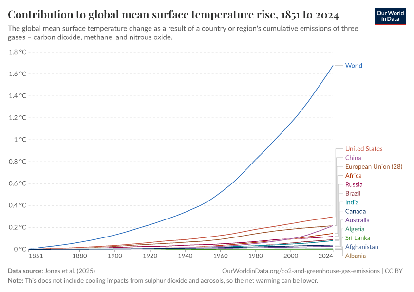 Jones et al. (2025) – with major processing by Our World in Data. “Change in global mean surface temperature caused by greenhouse gas emissions” [dataset]. Jones et al., “National contributions to climate change 2025.1” [original data]. Retrieved January 16, 2026 from https://archive.ourworldindata.org/20251204-133820/grapher/contribution-temp-rise-degrees.html (archived on December 4, 2025).