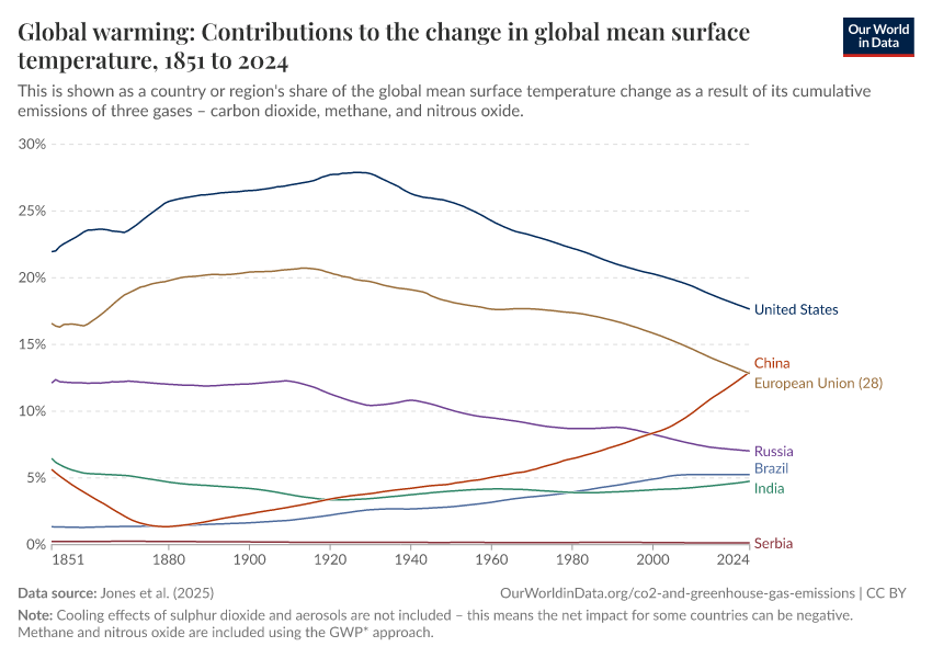 Jones et al. (2025) – with major processing by Our World in Data. “Share of contribution to global warming” [dataset]. Jones et al., “National contributions to climate change 2025.1” [original data]. Retrieved January 15, 2026 from https://archive.ourworldindata.org/20251204-133820/grapher/contributions-global-temp-change.html (archived on December 4, 2025).