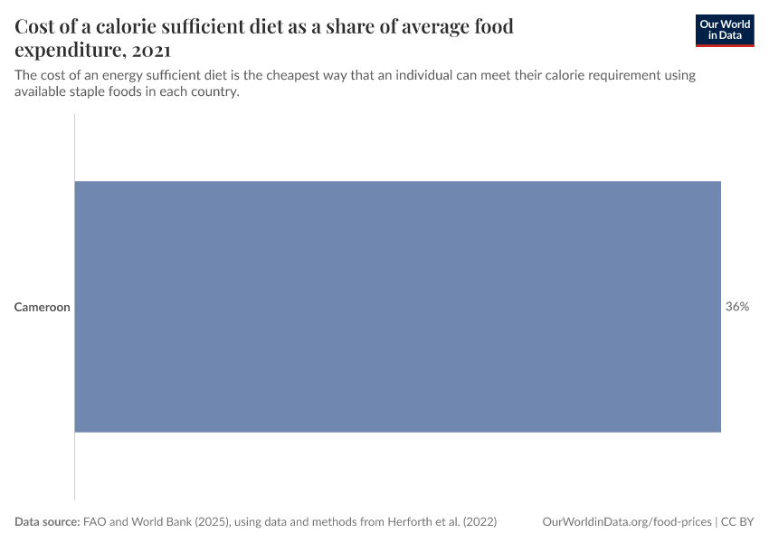 FAO and World Bank (2025), using data and methods from Herforth et al. (2022) – with minor processing by Our World in Data. “Cost of a calorie sufficient diet as a share of average food expenditure” [dataset]. Herforth et al. (2022), adapted by World Bank, “Food Prices for Nutrition 4.0” [original data]. Retrieved January 12, 2026 from https://archive.ourworldindata.org/20251013-180113/grapher/cost-calorie-sufficient-diet-share-food-expenditure.html (archived on October 13, 2025).