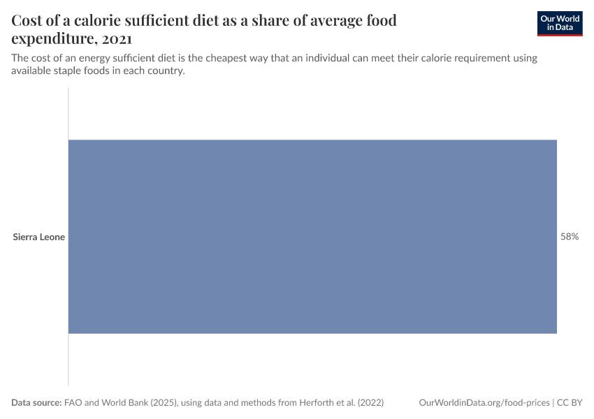 FAO and World Bank (2025), using data and methods from Herforth et al. (2022) – with minor processing by Our World in Data. “Cost of a calorie sufficient diet as a share of average food expenditure” [dataset]. Herforth et al. (2022), adapted by World Bank, “Food Prices for Nutrition 4.0” [original data]. Retrieved January 6, 2026 from https://archive.ourworldindata.org/20251013-180113/grapher/cost-calorie-sufficient-diet-share-food-expenditure.html (archived on October 13, 2025).