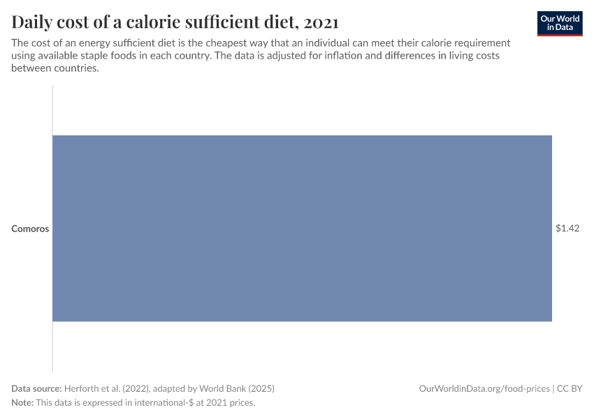 Herforth et al. (2022), adapted by World Bank (2025) – with minor processing by Our World in Data. “Daily cost of a calorie sufficient diet” [dataset]. Herforth et al. (2022), adapted by World Bank, “Food Prices for Nutrition 4.0” [original data]. Retrieved January 1, 2026 from https://archive.ourworldindata.org/20251013-180113/grapher/cost-calorie-sufficient-diet.html (archived on October 13, 2025).