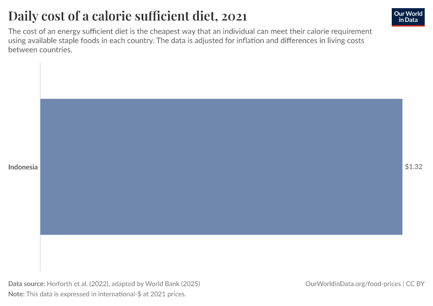 “Data Page: Daily cost of a calorie sufficient diet”, part of the following publication: Hannah Ritchie, Pablo Rosado, and Max Roser (2023) - “Food Prices”. Data adapted from Herforth et al. (2022), adapted by World Bank. Retrieved from https://archive.ourworldindata.org/20251013-180113/grapher/cost-calorie-sufficient-diet.html [online resource] (archived on October 13, 2025).How to cite this data