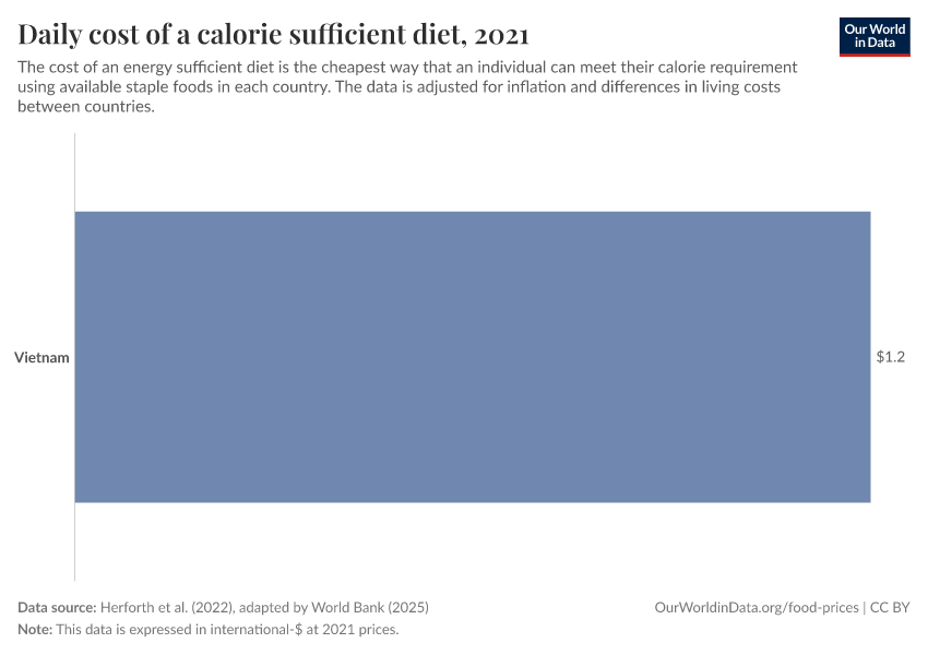 “Data Page: Daily cost of a calorie sufficient diet”, part of the following publication: Hannah Ritchie, Pablo Rosado, and Max Roser (2023) - “Food Prices”. Data adapted from Herforth et al. (2022), adapted by World Bank. Retrieved from https://archive.ourworldindata.org/20251013-180113/grapher/cost-calorie-sufficient-diet.html [online resource] (archived on October 13, 2025).How to cite this data