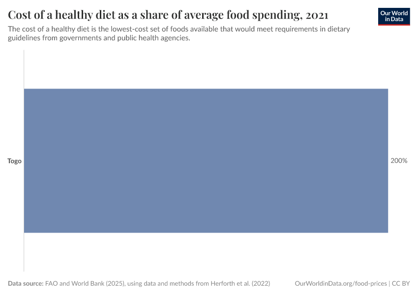 FAO and World Bank (2025), using data and methods from Herforth et al. (2022) – with minor processing by Our World in Data. “Cost of a healthy diet as a share of average food spending” [dataset]. Herforth et al. (2022), adapted by World Bank, “Food Prices for Nutrition 4.0” [original data]. Retrieved January 5, 2026 from https://archive.ourworldindata.org/20251013-180113/grapher/cost-healthy-diet-share-food-expenditure.html (archived on October 13, 2025).