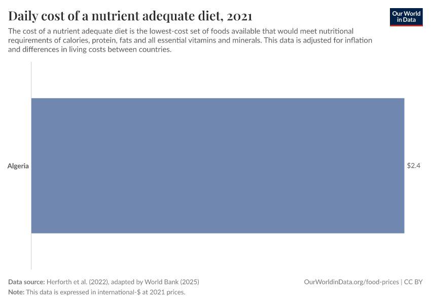 Herforth et al. (2022), adapted by World Bank (2025) – with minor processing by Our World in Data. “Daily cost of a nutrient adequate diet” [dataset]. Herforth et al. (2022), adapted by World Bank, “Food Prices for Nutrition 4.0” [original data]. Retrieved January 14, 2026 from https://archive.ourworldindata.org/20251013-180113/grapher/cost-nutritionally-adequate-diet.html (archived on October 13, 2025).