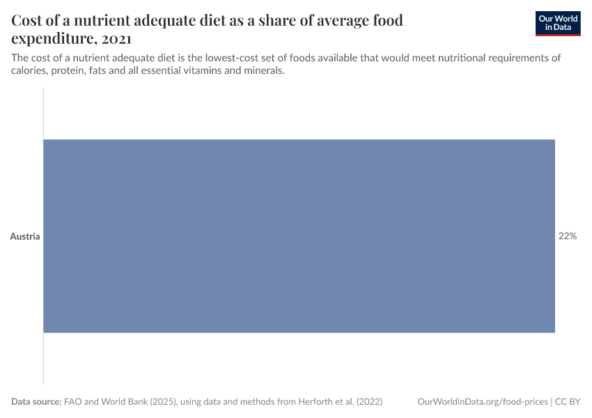 “Data Page: Cost of a nutrient adequate diet as a share of average food expenditure”, part of the following publication: Hannah Ritchie, Pablo Rosado, and Max Roser (2023) - “Food Prices”. Data adapted from Herforth et al. (2022), adapted by World Bank. Retrieved from https://archive.ourworldindata.org/20251013-180113/grapher/cost-nutritious-diet-share-food-expenditure.html [online resource] (archived on October 13, 2025).