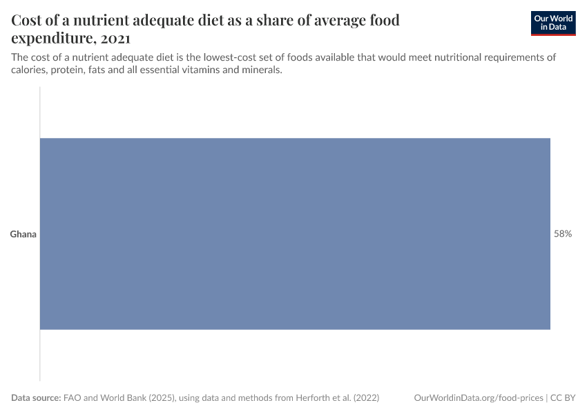 “Data Page: Cost of a nutrient adequate diet as a share of average food expenditure”, part of the following publication: Hannah Ritchie, Pablo Rosado, and Max Roser (2023) - “Food Prices”. Data adapted from Herforth et al. (2022), adapted by World Bank. Retrieved from https://archive.ourworldindata.org/20251013-180113/grapher/cost-nutritious-diet-share-food-expenditure.html [online resource] (archived on October 13, 2025).