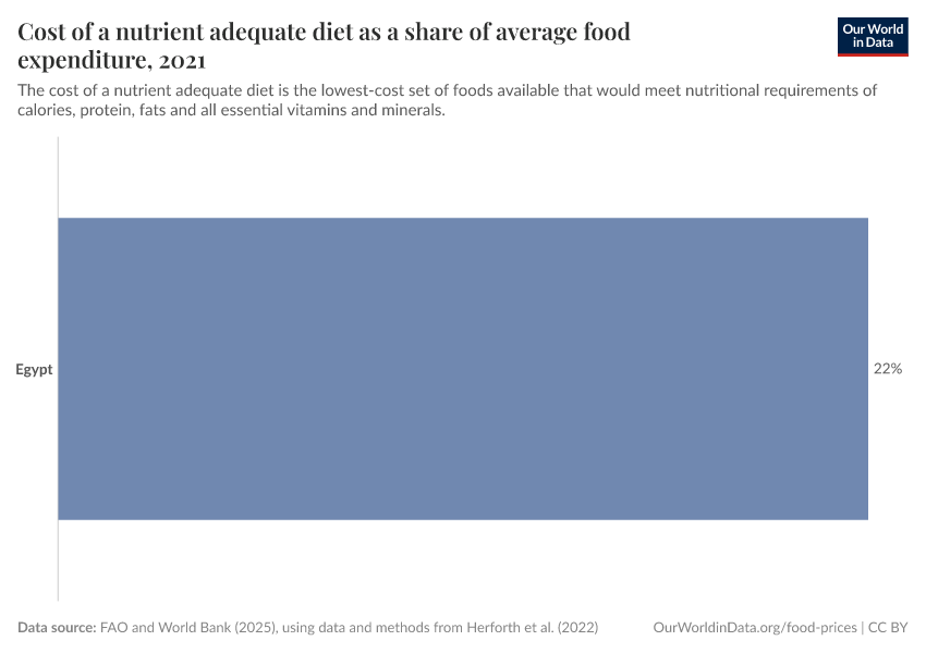“Data Page: Cost of a nutrient adequate diet as a share of average food expenditure”, part of the following publication: Hannah Ritchie, Pablo Rosado, and Max Roser (2023) - “Food Prices”. Data adapted from Herforth et al. (2022), adapted by World Bank. Retrieved from https://archive.ourworldindata.org/20251013-180113/grapher/cost-nutritious-diet-share-food-expenditure.html [online resource] (archived on October 13, 2025).How to cite this data