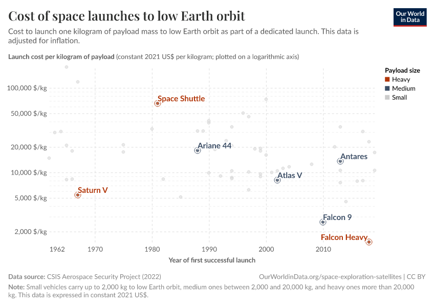CSIS Aerospace Security Project (2022) – with minor processing by Our World in Data. “Cost of space launches to low Earth orbit” [dataset]. CSIS Aerospace Security Project, “Cost of space launches” [original data]. Retrieved December 6, 2025 from https://archive.ourworldindata.org/20250909-093708/grapher/cost-space-launches-low-earth-orbit.html (archived on September 9, 2025).