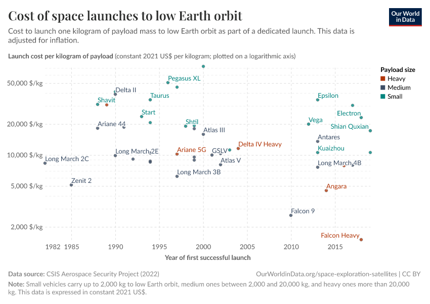 CSIS Aerospace Security Project (2022) – with minor processing by Our World in Data. “Cost of space launches to low Earth orbit” [dataset]. CSIS Aerospace Security Project, “Cost of space launches” [original data]. Retrieved December 5, 2025 from https://archive.ourworldindata.org/20250909-093708/grapher/cost-space-launches-low-earth-orbit.html (archived on September 9, 2025).