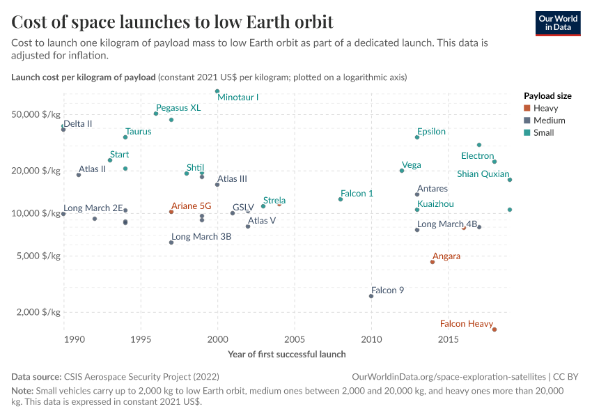 CSIS Aerospace Security Project (2022) – with minor processing by Our World in Data. “Cost of space launches to low Earth orbit” [dataset]. CSIS Aerospace Security Project, “Cost of space launches” [original data]. Retrieved February 22, 2026 from https://archive.ourworldindata.org/20250909-093708/grapher/cost-space-launches-low-earth-orbit.html (archived on September 9, 2025).