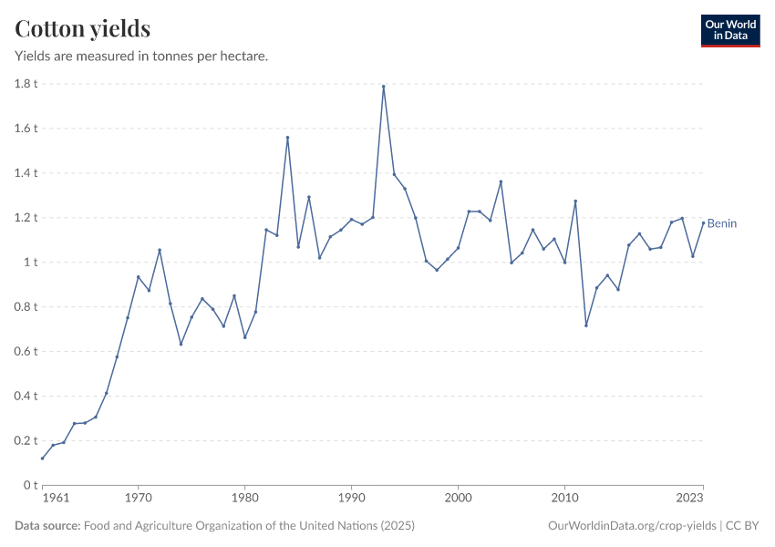 “Data Page: Seed cotton yields”, part of the following publication: Hannah Ritchie, Pablo Rosado, and Max Roser (2023) - “Agricultural Production”. Data adapted from Food and Agriculture Organization of the United Nations. Retrieved from https://archive.ourworldindata.org/20251014-161652/grapher/cotton-yield.html [online resource] (archived on October 14, 2025).