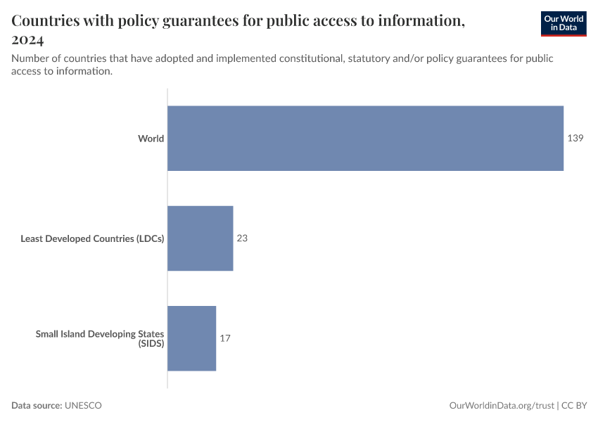 “Data Page: Countries with policy guarantees for public access to information”. Our World in Data (2026). Data adapted from UNESCO. Retrieved from https://archive.ourworldindata.org/20251125-165536/grapher/countries-that-adopt-guarantees-for-public-access-to-information.html [online resource] (archived on November 25, 2025).How to cite this data