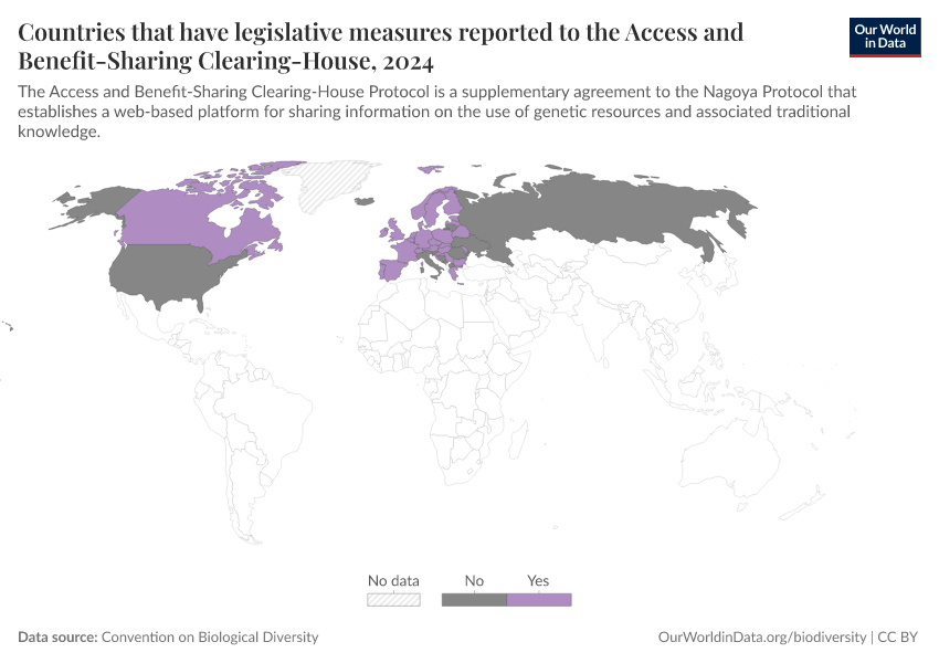 Convention on Biological Diversity – processed by Our World in Data. “Countries that have legislative measures reported to the Access and Benefit-Sharing Clearing-House” [dataset]. Convention on Biological Diversity, “https://absch.cbd.int/countries” [original data]. Retrieved February 26, 2026 from https://archive.ourworldindata.org/20260130-180113/grapher/countries-to-access-and-benefit-sharing-clearing-house.html (archived on January 30, 2026).