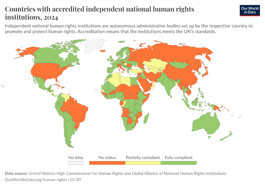 United Nations High Commissioner for Human Rights and Global Alliance of National Human Rights Institutions – processed by Our World in Data. “Countries with accredited independent national human rights institutions” [dataset]. United Nations High Commissioner for Human Rights and Global Alliance of National Human Rights Institutions, “Source: The Office of the United Nations High Commissioner for Human Rights (OHCHR) in collaboration with Global Alliance of National Human Rights Institutions (GANHRI).” [original data]. Retrieved January 15, 2026 from https://archive.ourworldindata.org/20251120-211038/grapher/countries-with-independent-national-human-rights-institution.html (archived on November 20, 2025).