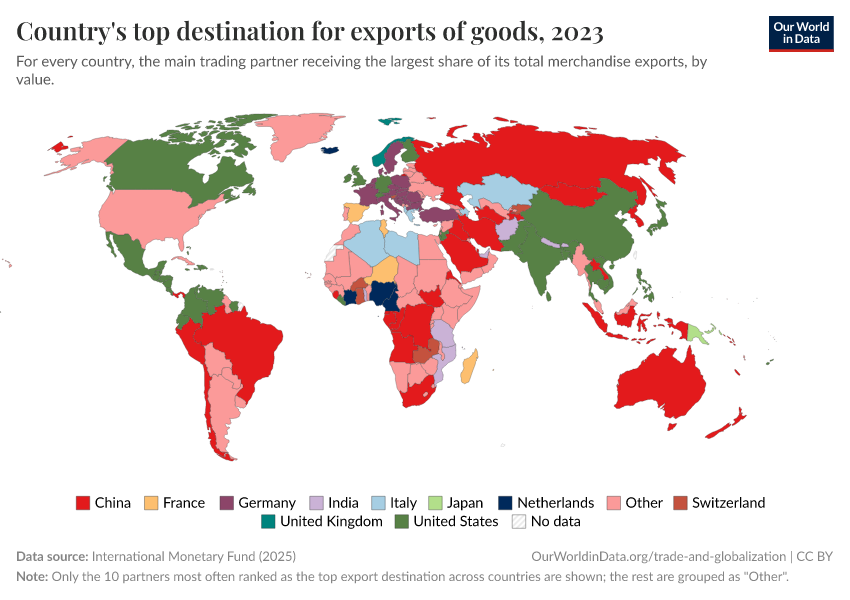 International Monetary Fund (2025) – with major processing by Our World in Data. “Top export partner category” [dataset]. International Monetary Fund, “International Trade in Goods (by partner country) (IMTS)” [original data]. Retrieved December 5, 2025 from https://archive.ourworldindata.org/20251114-012441/grapher/countrys-top-destination-for-exports-of-goods.html (archived on November 14, 2025).